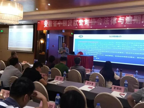 安徽省小额贷款公司协会为帮助小贷公司针对经营中可能出现的逾期贷款进行合理催收,提高逾期贷款的处置能力与催收技巧,于7月5-6日在合肥市举办了法律与逾期账款催收培训班,我司楼总受邀作为培训讲师之一。