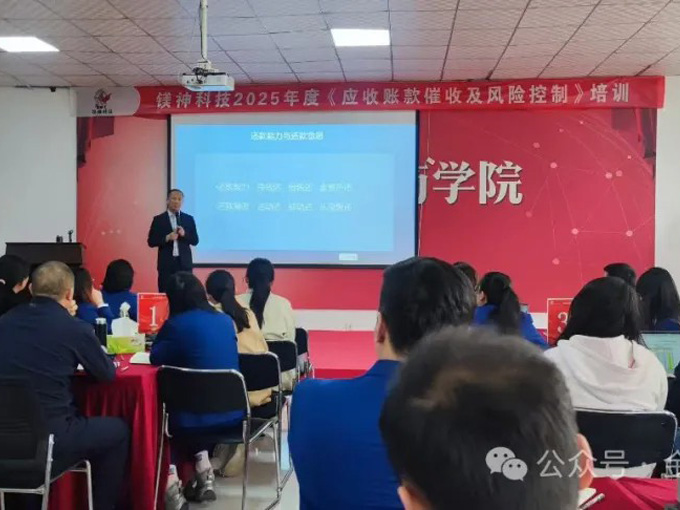 2025年4月4-5日楼老师为镁盐行业领先企业镁神科技公司做了“应收账款催收技巧与风险防范”内训课。该企业应收账款一个亿,目前发展稳定,没有坏账,逾期欠款也不多,主要是学习一下催收知识,预防风险,防范未然。 董事长亲自带队,全体高管、销售、财务80多人参加培训,两天时间大家放弃假期都不容易,希望今后越来越好。